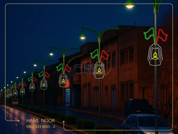 المان نوری مدل شام غریبان به منظور نور آرایی و آذین بندی شهری تولید وبه روش نصب بلواری برروی تیرچراغ برق درارتفاع مشخص نصب و اجرا می گردد. این المان نوری از ترکیب پروفیل و لوله سبک صنعتی آلیاژی و آرماتور ساخته می شود.به گونه ای که اجزای مختلف المان نوری شام غریبان پس از طراحی در ابعاد و اندازه های متناسب با طرح برش خورده و سپس به صورت مکانیزه خم کاری و پس از آن عملیات جوشکاری روی آن انجام می گیرد. در ادامه سازه بدست آمده در واحد رنگ آمیزی به صورت سه لایه رنگ آمیزی شده و در نهایت جهت مونتاژ منبع نور بر روی سازه به واحد مونتاژ منتقل می شود.المان نوری شام غریبان در ابعاد 2 متر در 1.3 متر قابل تولید می باشد.این المان نوری قابلیت تولید به صورت تک رنگ و ترکیب چند رنگ مختلف را نیز دارد. از دیگر خصوصیات این المان نوری می توان به وزن سبک ،سهولت در نصب و حمل آسان آن اشاره کرد. جهت نصب این المان نوری به پایه چراغ برق بست فلزی مخصوص تعبیه شده است،به طوریکه نصب این المان نوری بدون نیاز به هرگونه سوراخکاری و جوشکاری را ممکن میسازد.المان نوری شام غریبان با گارانتی یکساله به مشتریان عرضه میگردد